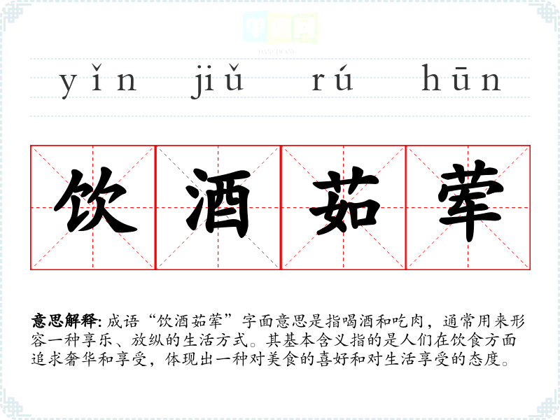 成语“饮酒茹荤”字面意思是指喝酒和吃肉,通常用来形容一种享乐、放纵的生活方式。其基本含义指的是人们在饮食方面追求奢华和享受,体现出一种对美食的喜好和对生活享受的态度。