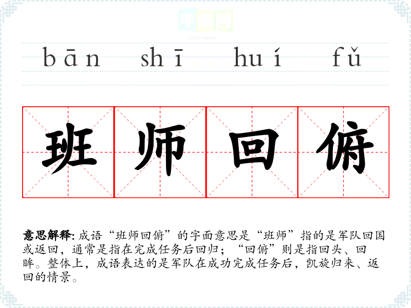 成语“班师回俯”的字面意思是“班师”指的是军队回国或返回,通常是指在完成任务后回归;“回俯”则是指回头、回眸。整体上,成语表达的是军队在成功完成任务后,凯旋归来、返回的情景。