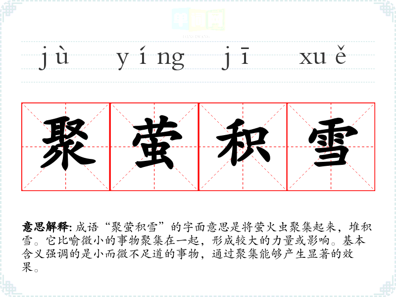 - 积少成多:意指少量的积累最终会形成较大的数量,与“聚萤积雪”的意义相似。