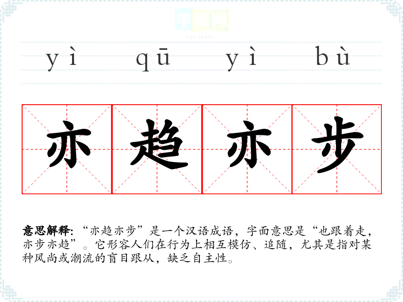 “亦趋亦步”是一个汉语成语,字面意思是“也跟着走,亦步亦趋”。它形容人们在行为上相互模仿、追随,尤其是指对某种风尚或潮流的盲目跟从,缺乏自主性。