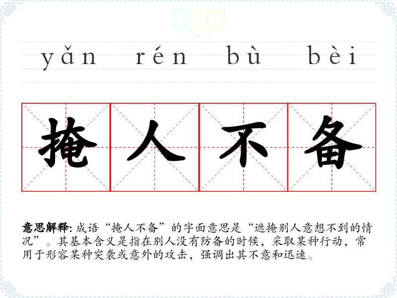 成语“掩人不备”的字面意思是“遮掩别人意想不到的情况”。其基本含义是指在别人没有防备的时候,采取某种行动,常用于形容某种突袭或意外的攻击,强调出其不意和迅速。