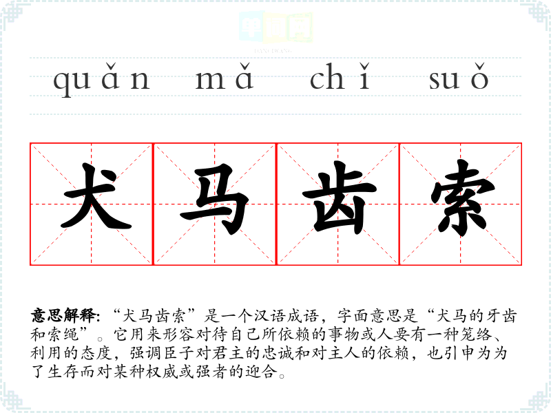 “犬马齿索”是一个汉语成语,字面意思是“犬马的牙齿和索绳”。它用来形容对待自己所依赖的事物或人要有一种笼络、利用的态度,强调臣子对君主的忠诚和对主人的依赖,也引申为为了生存而对某种权威或强者的迎合。