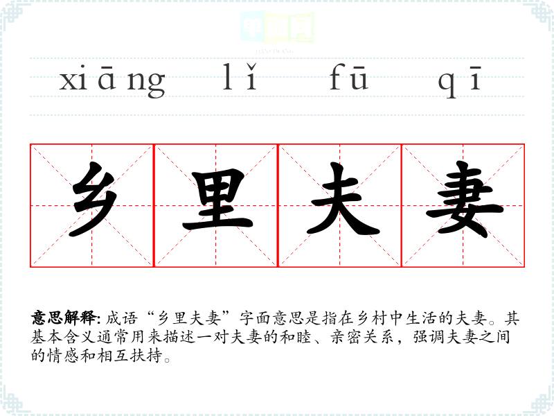 成语“乡里夫妻”字面意思是指在乡村中生活的夫妻。其基本含义通常用来描述一对夫妻的和睦、亲密关系,强调夫妻之间的情感和相互扶持。