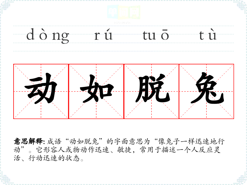 成语“动如脱兔”的字面意思为“像兔子一样迅速地行动”。它形容人或物动作迅速、敏捷,常用于描述一个人反应灵活、行动迅速的状态。