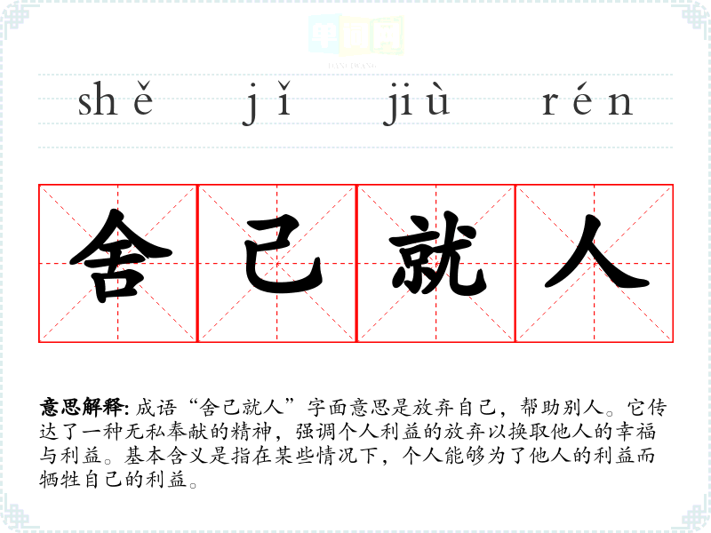 | 舍己为人 | 舍弃自己的利益去帮助别人。 |