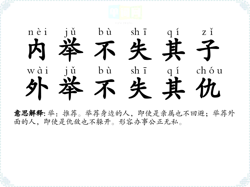 | 内举不避亲,外举不避怨 | 举:推荐。举荐身边的人,即使是亲属也不回避;举荐外面的人,即使是仇敌也不躲开。形容办事公正无私。 |