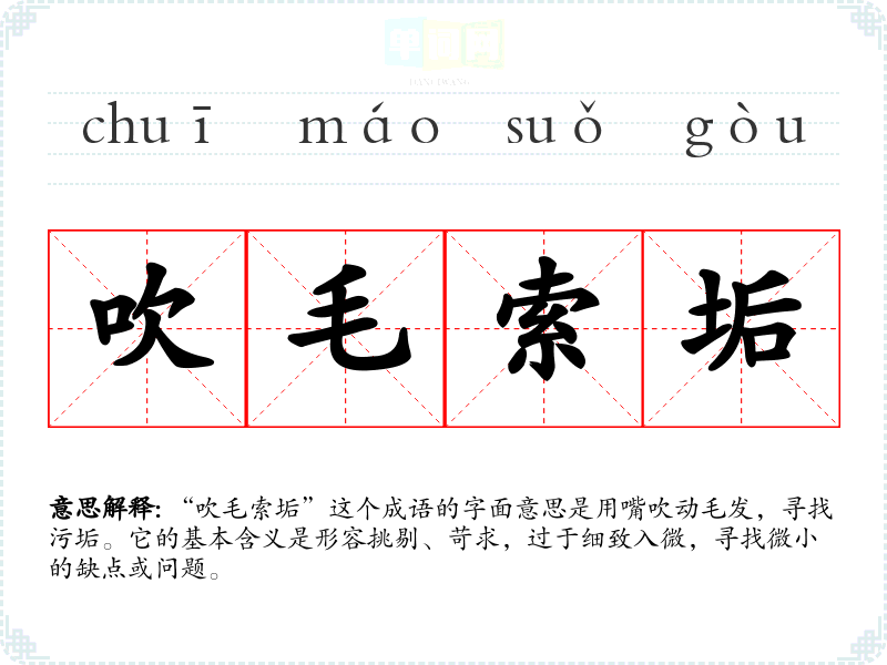 | 吹毛索垢 | 吹开皮上的毛寻疤痕。比喻故意挑剔别人的缺点,寻找差错。 |