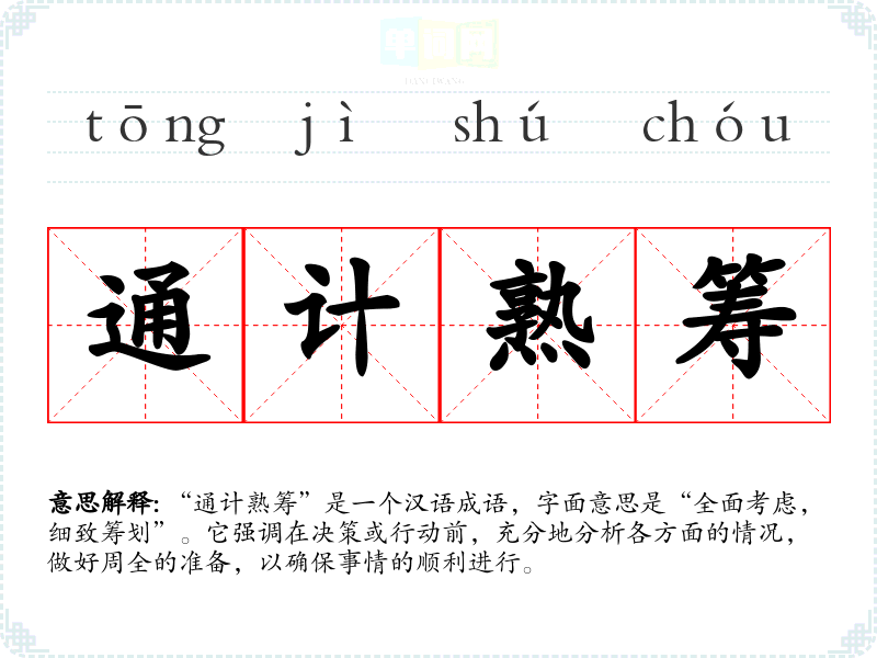 “通计熟筹”是一个汉语成语,字面意思是“全面考虑,细致筹划”。它强调在决策或行动前,充分地分析各方面的情况,做好周全的准备,以确保事情的顺利进行。