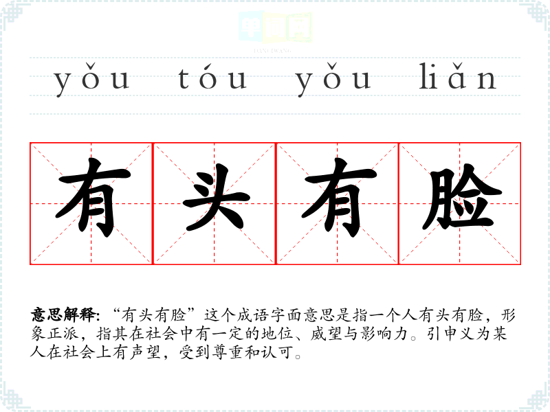 “有头有脸”这个成语字面意思是指一个人有头有脸,形象正派,指其在社会中有一定的地位、威望与影响力。引申义为某人在社会上有声望,受到尊重和认可。