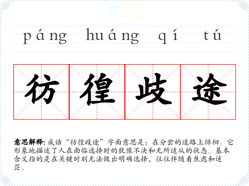 成语“彷徨歧途”字面意思是:在分岔的道路上徘徊。它形象地描述了人在面临选择时的犹豫不决和无所适从的状态。基本含义指的是在关键时刻无法做出明确选择,往往伴随着焦虑和迷茫。
