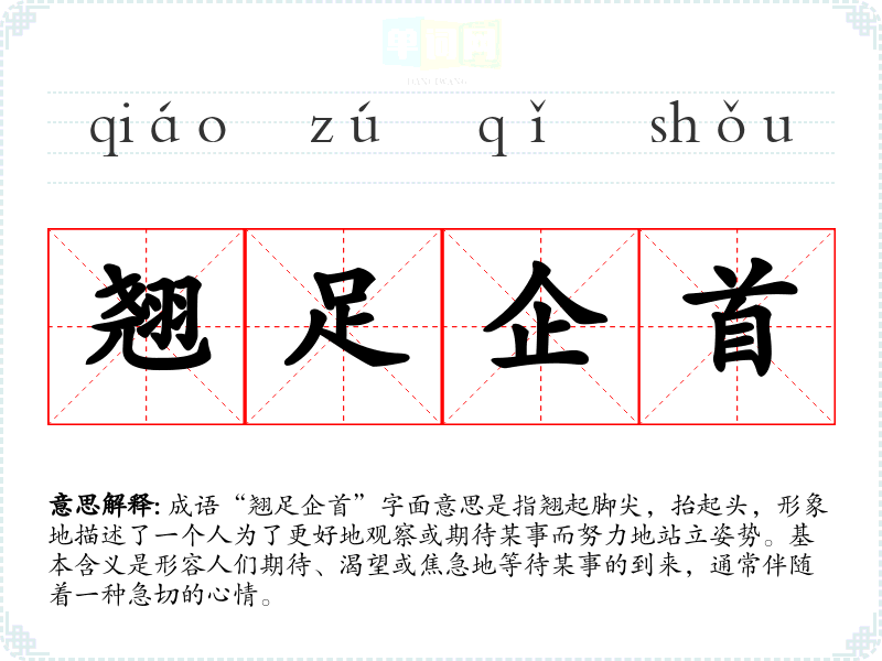 成语“翘足企首”字面意思是指翘起脚尖,抬起头,形象地描述了一个人为了更好地观察或期待某事而努力地站立姿势。基本含义是形容人们期待、渴望或焦急地等待某事的到来,通常伴随着一种急切的心情。