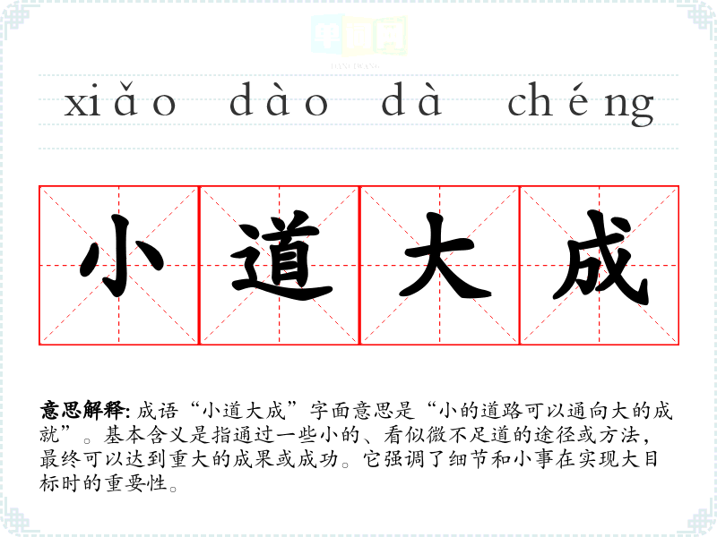 成语“小道大成”字面意思是“小的道路可以通向大的成就”。基本含义是指通过一些小的、看似微不足道的途径或方法,最终可以达到重大的成果或成功。它强调了细节和小事在实现大目标时的重要性。
