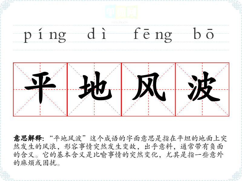 “平地风波”这个成语的字面意思是指在平坦的地面上突然发生的风浪,形容事情突然发生变故,出乎意料,通常带有负面的含义。它的基本含义是比喻事情的突然变化,尤其是指一些意外的麻烦或困扰。