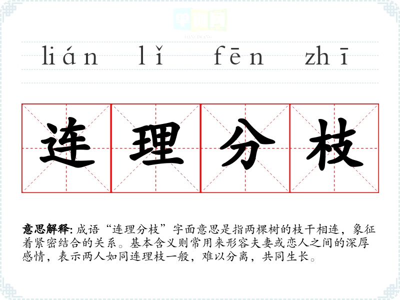 成语“连理分枝”字面意思是指两棵树的枝干相连,象征着紧密结合的关系。基本含义则常用来形容夫妻或恋人之间的深厚感情,表示两人如同连理枝一般,难以分离,共同生长。