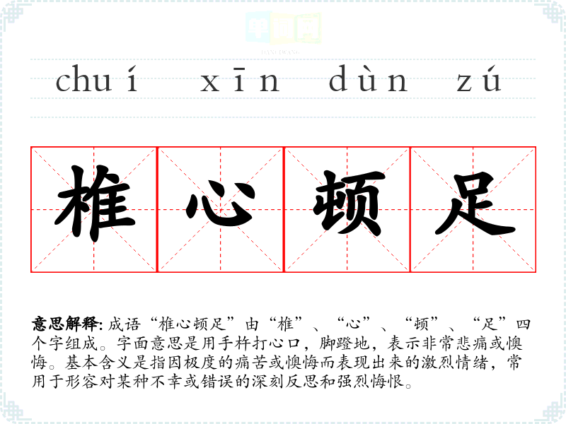 成语“椎心顿足”由“椎”、“心”、“顿”、“足”四个字组成。字面意思是用手杵打心口,脚蹬地,表示非常悲痛或懊悔。基本含义是指因极度的痛苦或懊悔而表现出来的激烈情绪,常用于形容对某种不幸或错误的深刻反思和强烈悔恨。