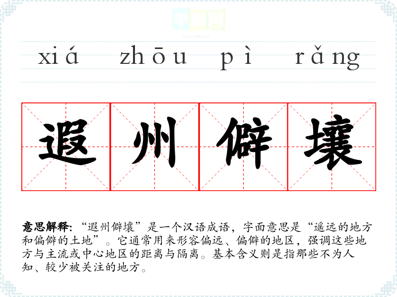 “遐州僻壤”源自古代地理概念,其中“遐”表示遥远,“州”可以引申为行政区域,“僻”指偏僻,“壤”意为土地。虽然没有明确的文学出处,但可以推测其形成与古代对遥远地区的描绘有关,反映了人们对偏远地区的认知与态度。