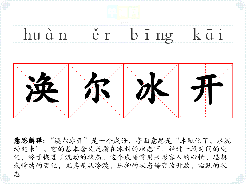 “涣尔冰开”带给人的情感反应是温暖与希望,象征着内心的解放和变化。这种变化常常让人感到释然和愉悦,激励人们在面对困境时,保持积极的心态。