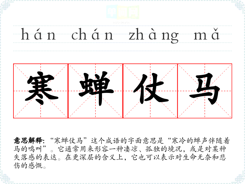 “寒蝉仗马”这个成语的字面意思是“寒冷的蝉声伴随着马的鸣叫”。它通常用来形容一种凄凉、孤独的境况,或是对某种失落感的表达。在更深层的含义上,它也可以表示对生命无奈和悲伤的感慨。