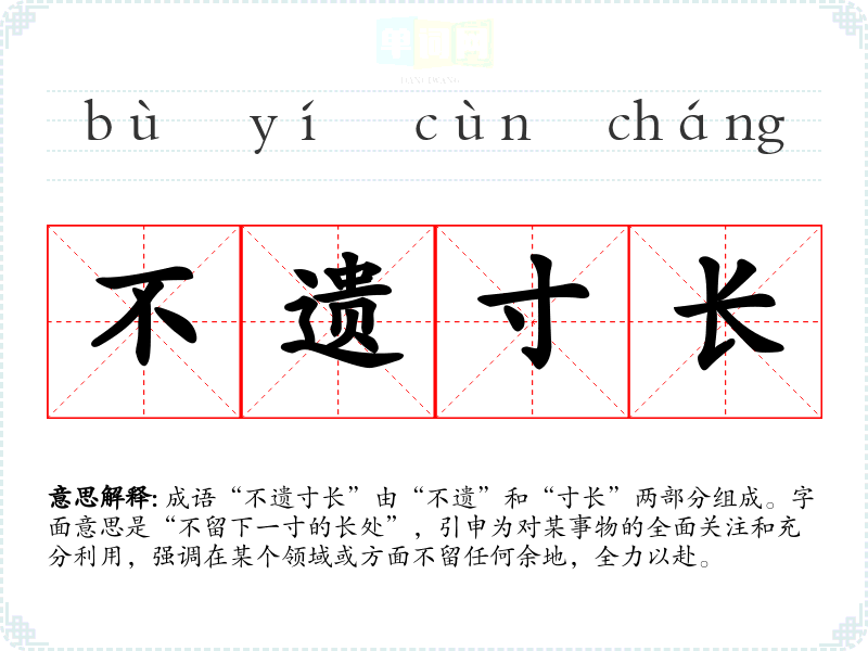 成语“不遗寸长”由“不遗”和“寸长”两部分组成。字面意思是“不留下一寸的长处”,引申为对某事物的全面关注和充分利用,强调在某个领域或方面不留任何余地,全力以赴。