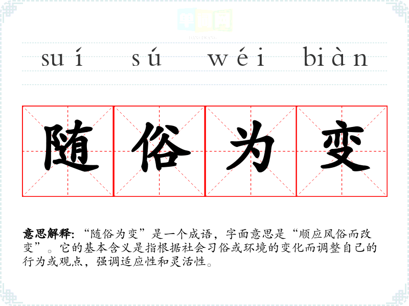 | 随俗为变 | 随:顺从;俗:世俗。指顺随风俗而变化。 |