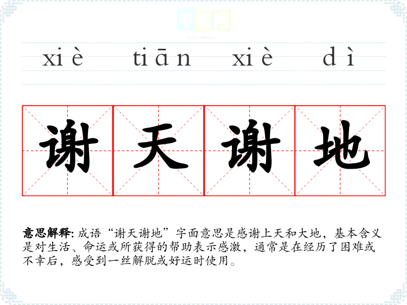 成语“谢天谢地”字面意思是感谢上天和大地,基本含义是对生活、命运或所获得的帮助表示感激,通常是在经历了困难或不幸后,感受到一丝解脱或好运时使用。