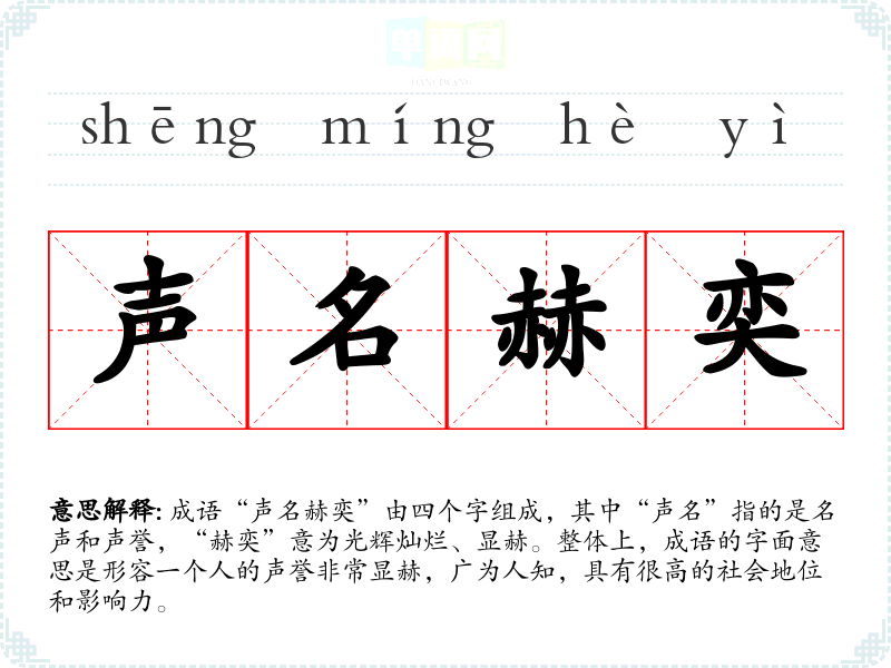 成语“声名赫奕”由四个字组成,其中“声名”指的是名声和声誉,“赫奕”意为光辉灿烂、显赫。整体上,成语的字面意思是形容一个人的声誉非常显赫,广为人知,具有很高的社会地位和影响力。