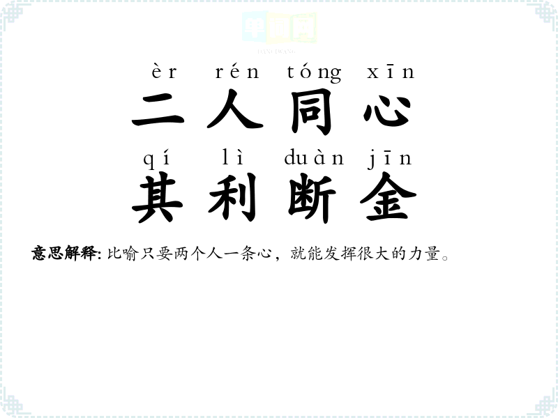 | 二人同心,其利断金 | 比喻只要两个人一条心,就能发挥很大的力量。 |