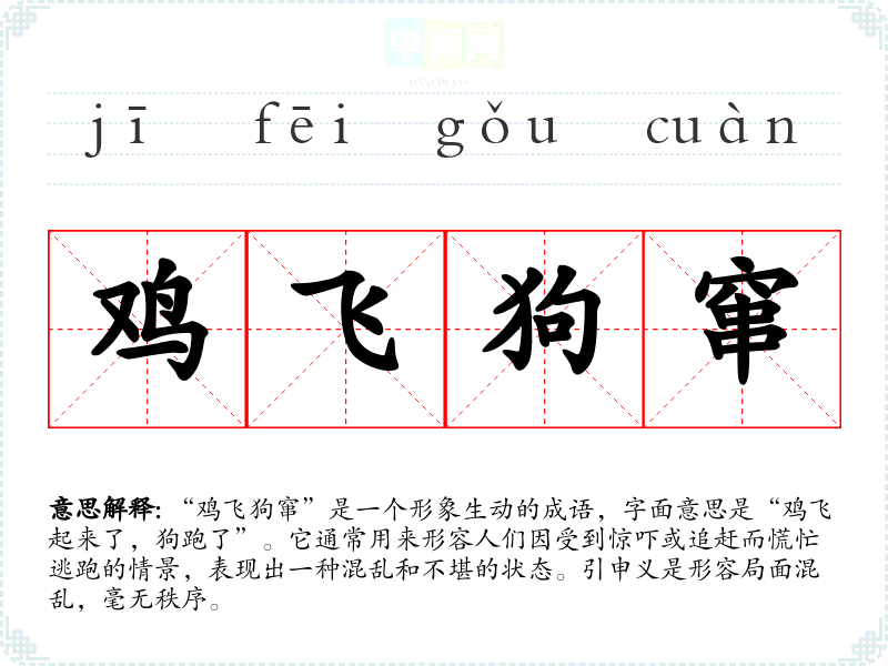 “鸡飞狗窜”是一个形象生动的成语,字面意思是“鸡飞起来了,狗跑了”。它通常用来形容人们因受到惊吓或追赶而慌忙逃跑的情景,表现出一种混乱和不堪的状态。引申义是形容局面混乱,毫无秩序。