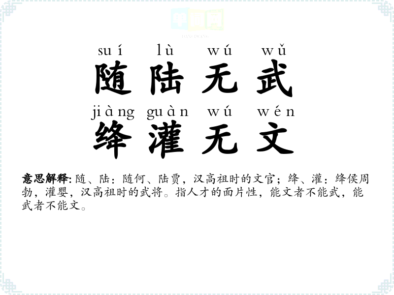| 随陆无武,绛灌无文 | 随、陆:随何、陆贾,汉高祖时的文官;绛、灌:绛侯周勃,灌婴,汉高祖时的武将。指人才的面片性,能文者不能武,能武者不能文。 |