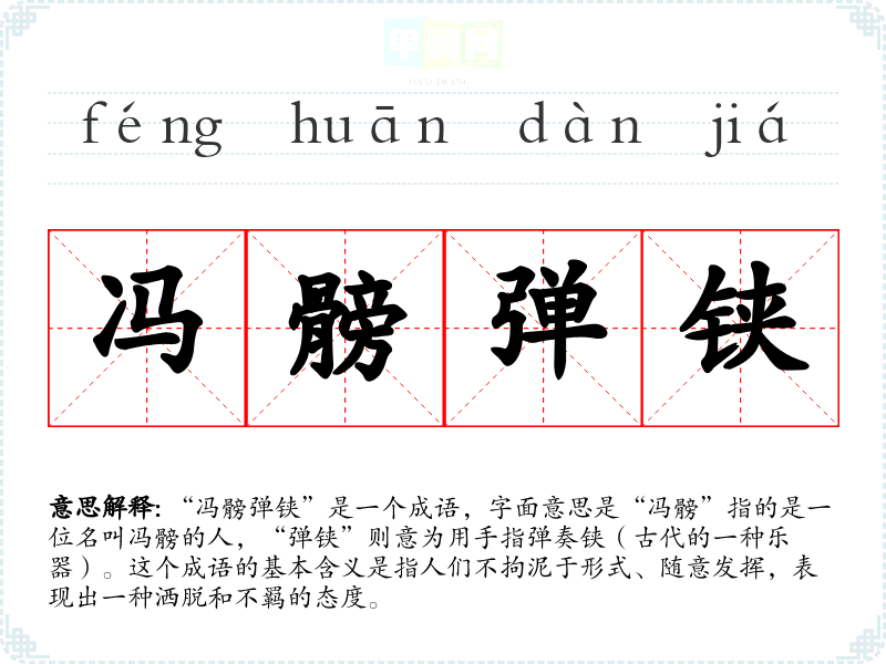 “冯髈弹铗”是一个成语,字面意思是“冯髈”指的是一位名叫冯髈的人,“弹铗”则意为用手指弹奏铗(古代的一种乐器)。这个成语的基本含义是指人们不拘泥于形式、随意发挥,表现出一种洒脱和不羁的态度。