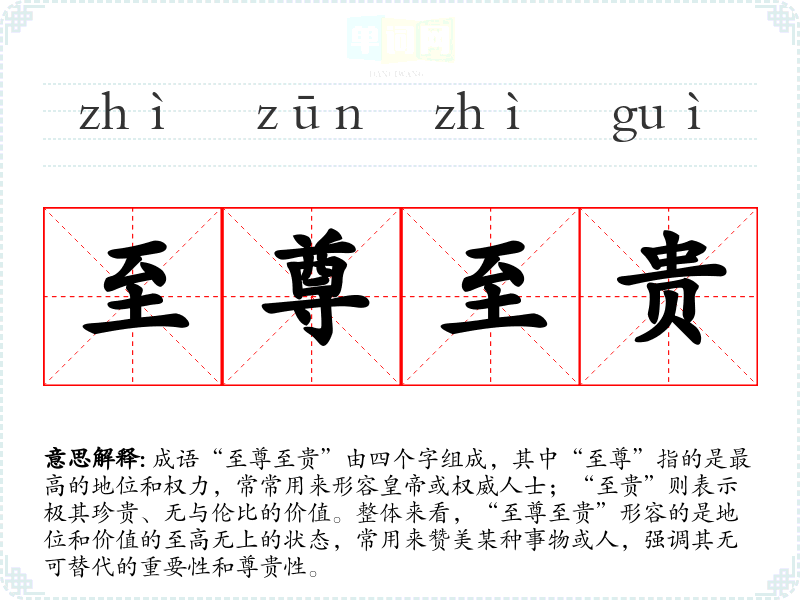 成语“至尊至贵”由四个字组成,其中“至尊”指的是最高的地位和权力,常常用来形容**或权威人士;“至贵”则表示极其珍贵、无与伦比的价值。整体来看,“至尊至贵”形容的是地位和价值的至高无上的状态,常用来赞美某种事物或人,强调其无可替代的重要性和尊贵性。