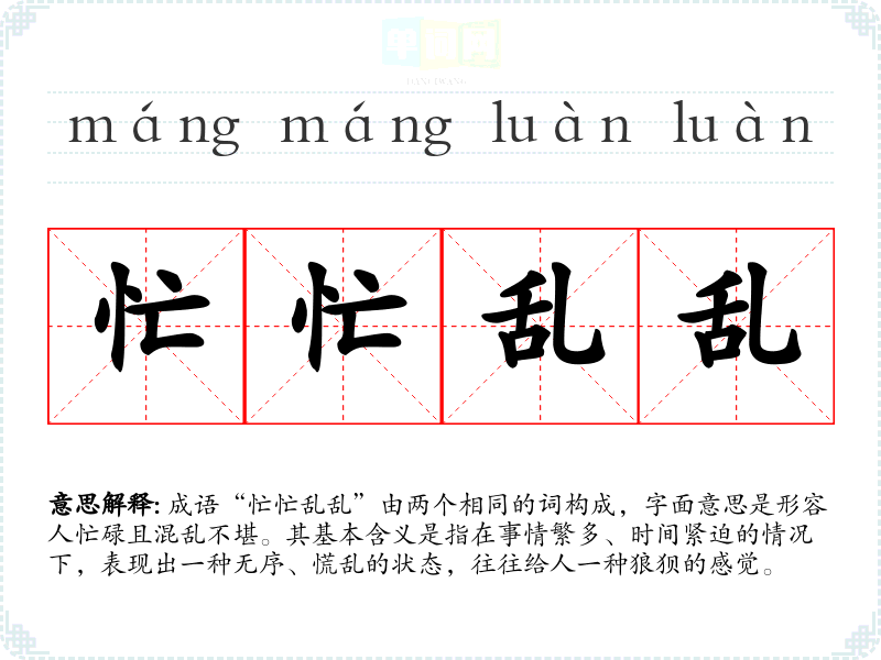 成语“忙忙乱乱”由两个相同的词构成,字面意思是形容人忙碌且混乱不堪。其基本含义是指在事情繁多、时间紧迫的情况下,表现出一种无序、慌乱的状态,往往给人一种狼狈的感觉。