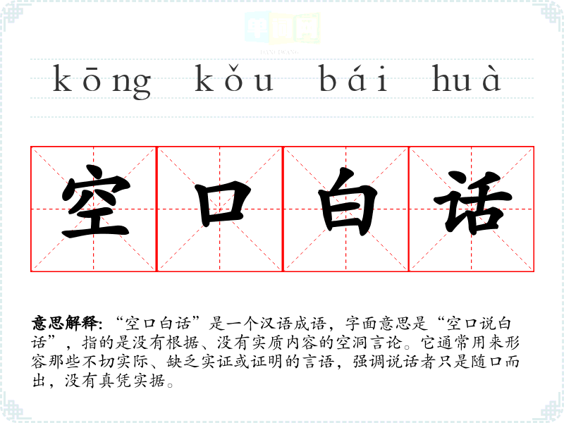 | 空口白话 | 形容只说不实行,或只说而没有事实证明。 |