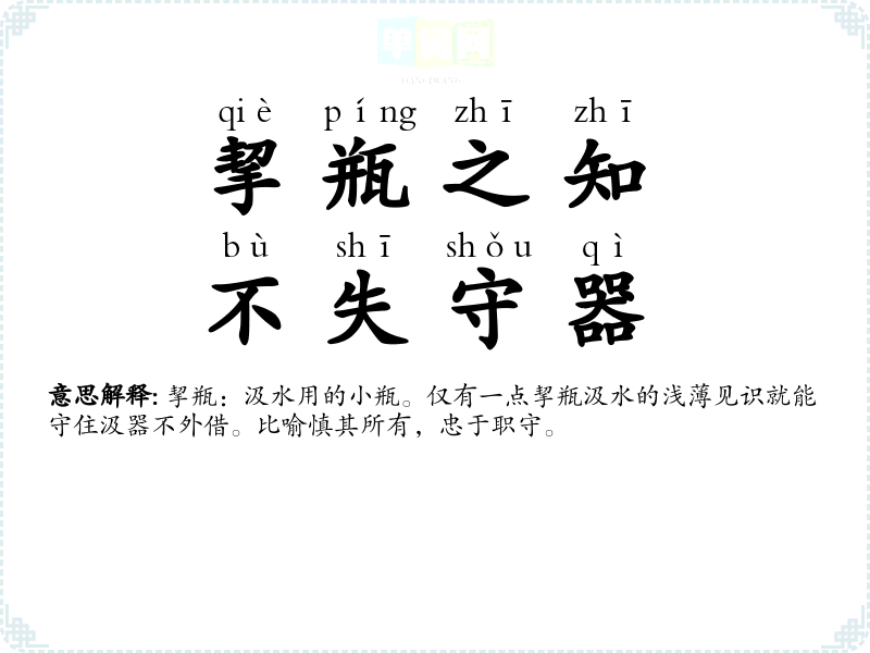 | 挈瓶之智,守不假器 | 挈瓶:汲水用的小瓶。仅有一点挈瓶汲水的浅薄见识就能守住汲器不外借。比喻慎其所有,忠于职守。 |
