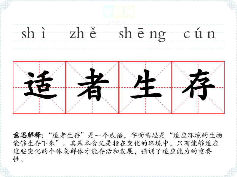 “适者生存”是一个成语,字面意思是“适应环境的生物能够生存下来”。其基本含义是指在变化的环境中,只有能够适应这些变化的个体或群体才能存活和发展,强调了适应能力的重要性。