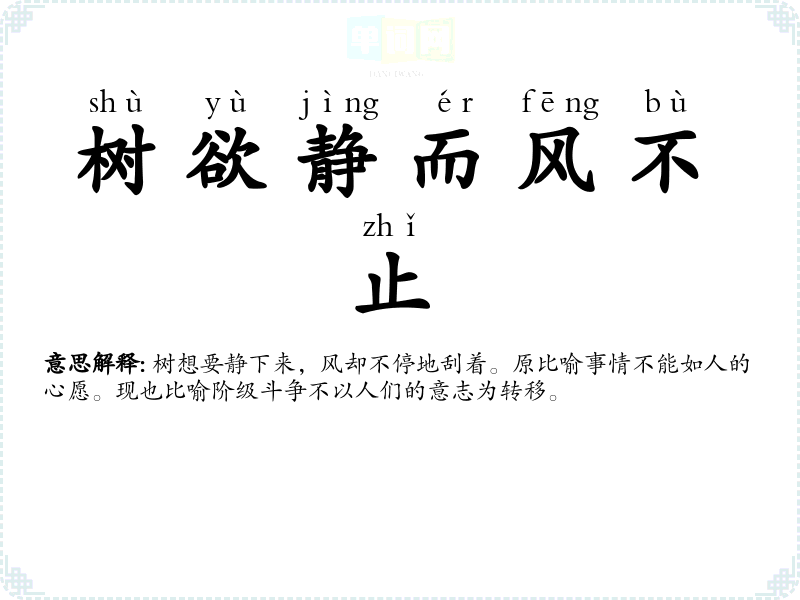 树想要静下来,风却不停地刮着。原比喻事情不能如人的心愿。现也比喻阶级斗争不以人们的意志为转移。