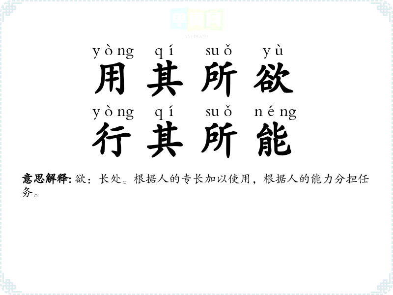 | 用其所欲,行其所能 | 欲:长处。根据人的专长加以使用,根据人的能力分担任务。 |