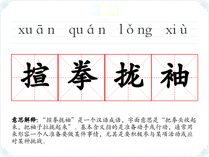 该成语的历史背景并不十分明确,但可以追溯到古代武术或斗争的场景。揎拳象征着准备出拳,表示一种勇敢、积极的态度;而拢袖则是为了方便行动,表明不再拘束。这个成语在古文学中可能出现过,反映了古人面对挑战时的心理状态。