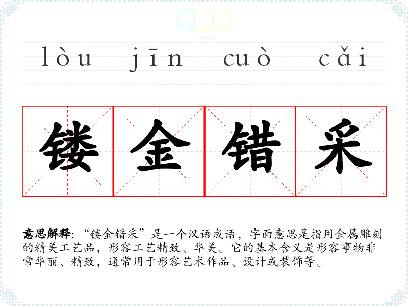 “镂金错采”是一个汉语成语,字面意思是指用金属雕刻的精美工艺品,形容工艺精致、华美。它的基本含义是形容事物非常华丽、精致,通常用于形容艺术作品、设计或装饰等。