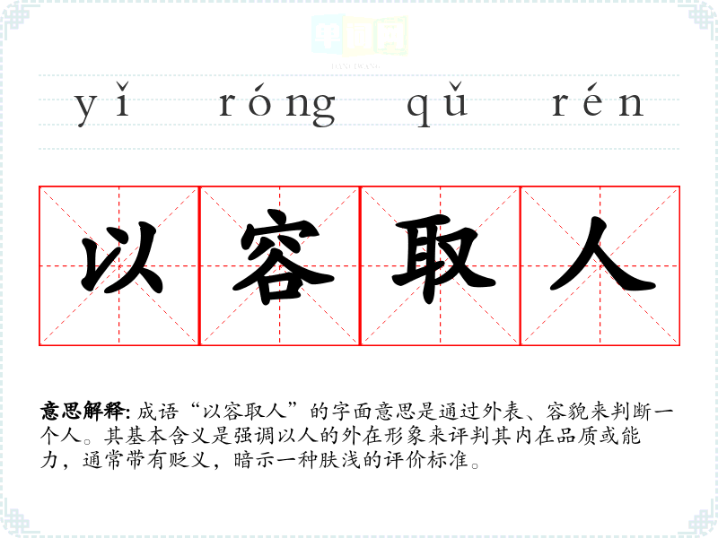 成语“以容取人”的字面意思是通过外表、容貌来判断一个人。其基本含义是强调以人的外在形象来评判其内在品质或能力,通常带有贬义,暗示一种肤浅的评价标准。