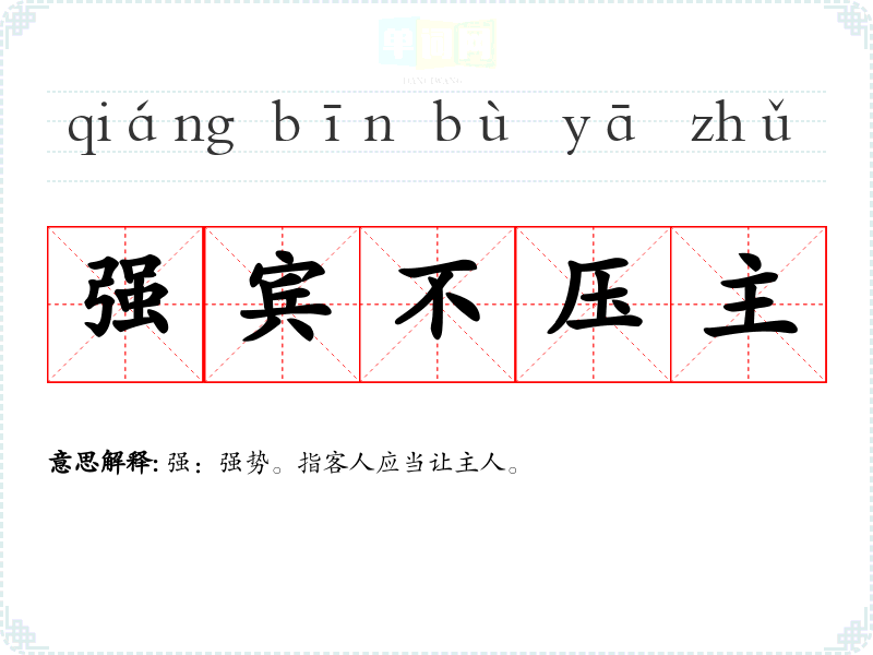 | 喧宾夺主 | 喧:声音大。客人的声音压倒了主人的声音。比喻外来的或次要的事物占据了原有的或主要的事物的位置。 |