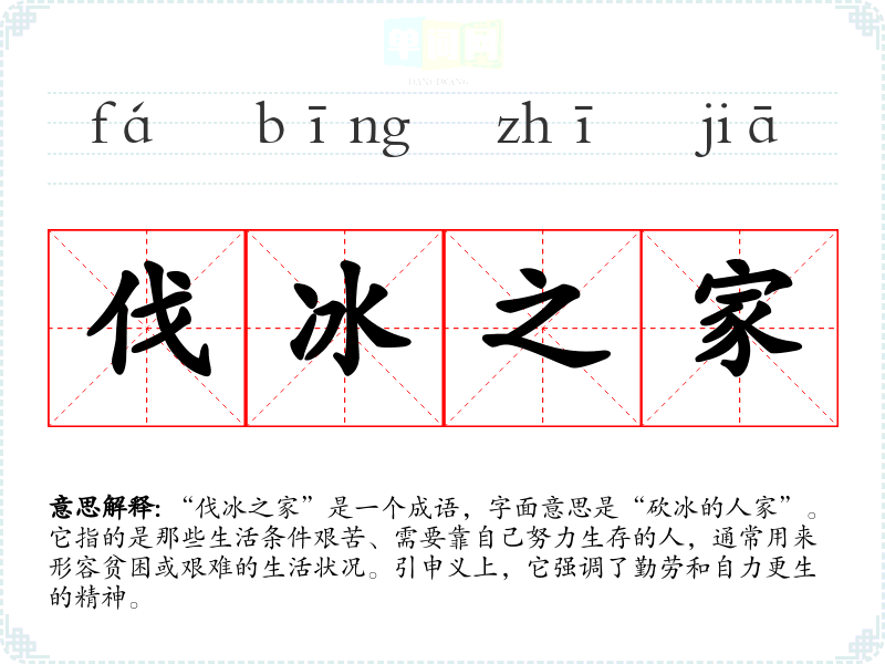 “伐冰之家”是一个成语,字面意思是“砍冰的人家”。它指的是那些生活条件艰苦、需要靠自己努力生存的人,通常用来形容贫困或艰难的生活状况。引申义上,它强调了勤劳和自力更生的精神。