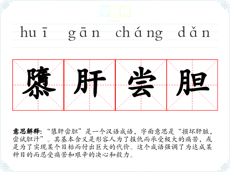 “隳肝尝胆”是一个汉语成语,字面意思是“损坏肝脏,尝试胆汁”。其基本含义是形容人为了报仇而承受极大的痛苦,或是为了实现某个目标而付出巨大的代价。这个成语强调了为达成某种目的而忍受痛苦和艰辛的决心和毅力。