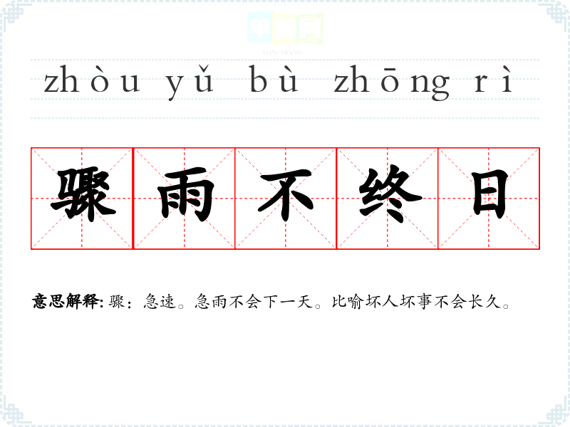 | 骤雨不终日 | 骤:急速。急雨不会下一天。比喻坏人坏事不会长久。 |