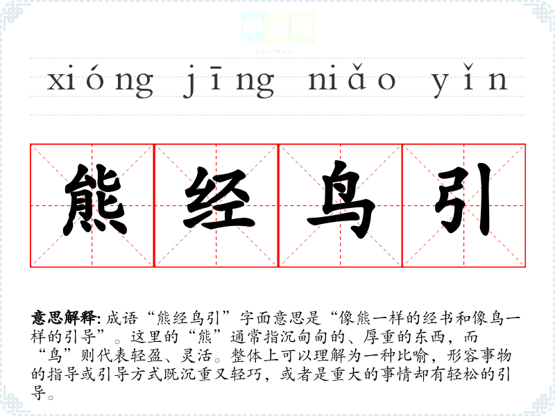 成语“熊经鸟引”字面意思是“像熊一样的经书和像鸟一样的引导”。这里的“熊”通常指沉甸甸的、厚重的东西,而“鸟”则代表轻盈、灵活。整体上可以理解为一种比喻,形容事物的指导或引导方式既沉重又轻巧,或者是重大的事情却有轻松的引导。