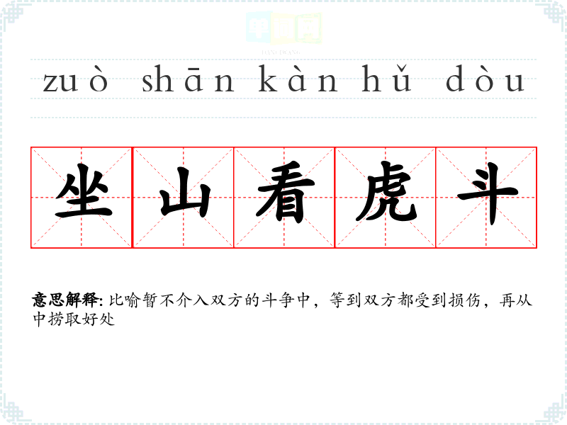 | 坐山看虎斗 | 比喻暂不介入双方的斗争中,等到双方都受到损伤,再从中捞取好处 |