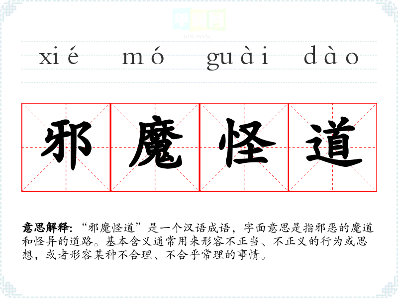 - 邪门歪道:形容不正当的行为或思想,和“邪魔怪道”意思相近。