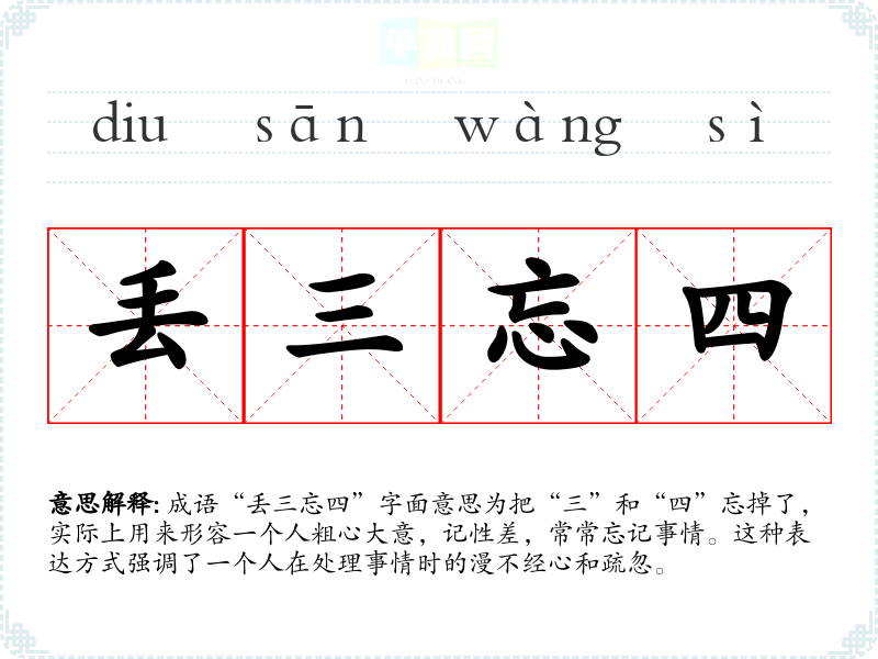 成语“丢三忘四”字面意思为把“三”和“四”忘掉了,实际上用来形容一个人粗心大意,记性差,常常忘记事情。这种表达方式强调了一个人在处理事情时的漫不经心和疏忽。