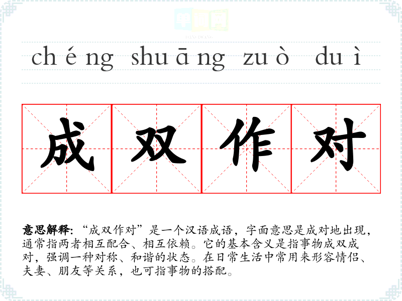“成双作对”是一个汉语成语,字面意思是成对地出现,通常指两者相互配合、相互依赖。它的基本含义是指事物成双成对,强调一种对称、和谐的状态。在日常生活中常用来形容情侣、夫妻、朋友等关系,也可指事物的搭配。
