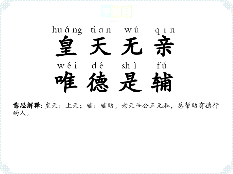 | 皇天无亲,唯德是辅 | 皇天:上天;辅:辅助。老天爷公正无私,总帮助有德行的人。 |